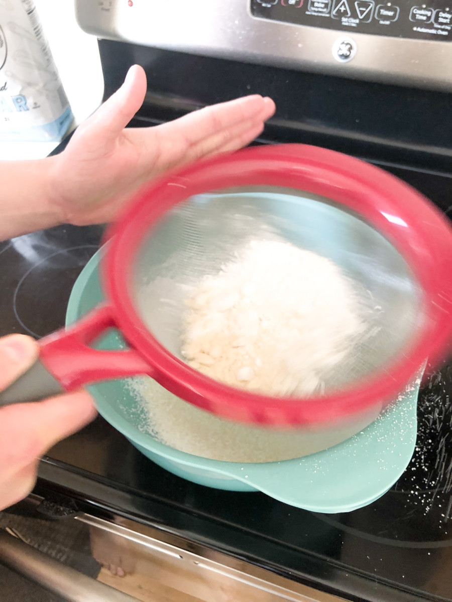 - In a large bowl, sift together the almond flour and powdered sugar. There may be some clumps left that don’t sift through, do not include them in your mixture. You need to have 1 1/2 cups of almond flour and 2 cups of powdered sugar after they are sifted, so you may need to add a little extra when you’re sifting.